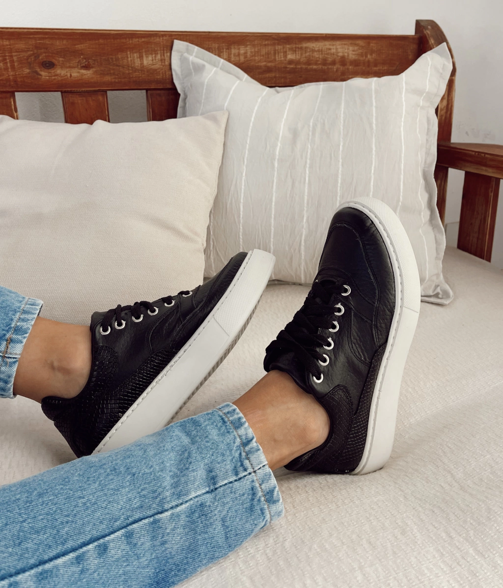 Zapas de cuero negro floater y reptil negro con base baja súper liviana pegada y cosida.