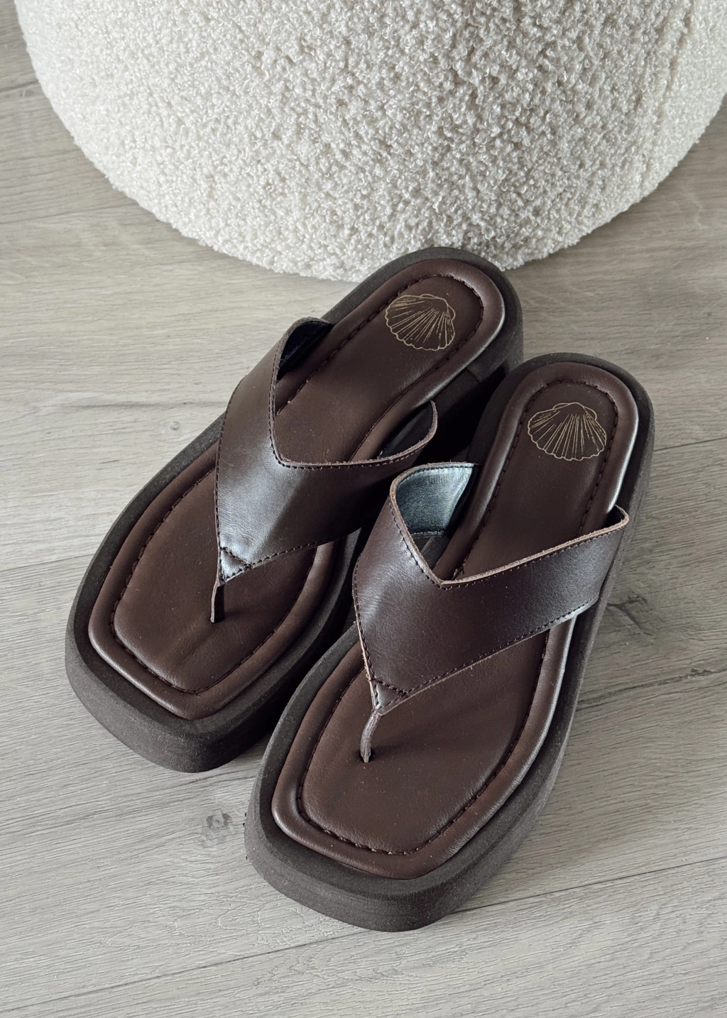 Sandalias tipo ojota con plataforma, diseñadas para uso diario, con capellada de cuero chocolate. Cuentan con una base alta de goma eva ultra liviana (son una pluma)
